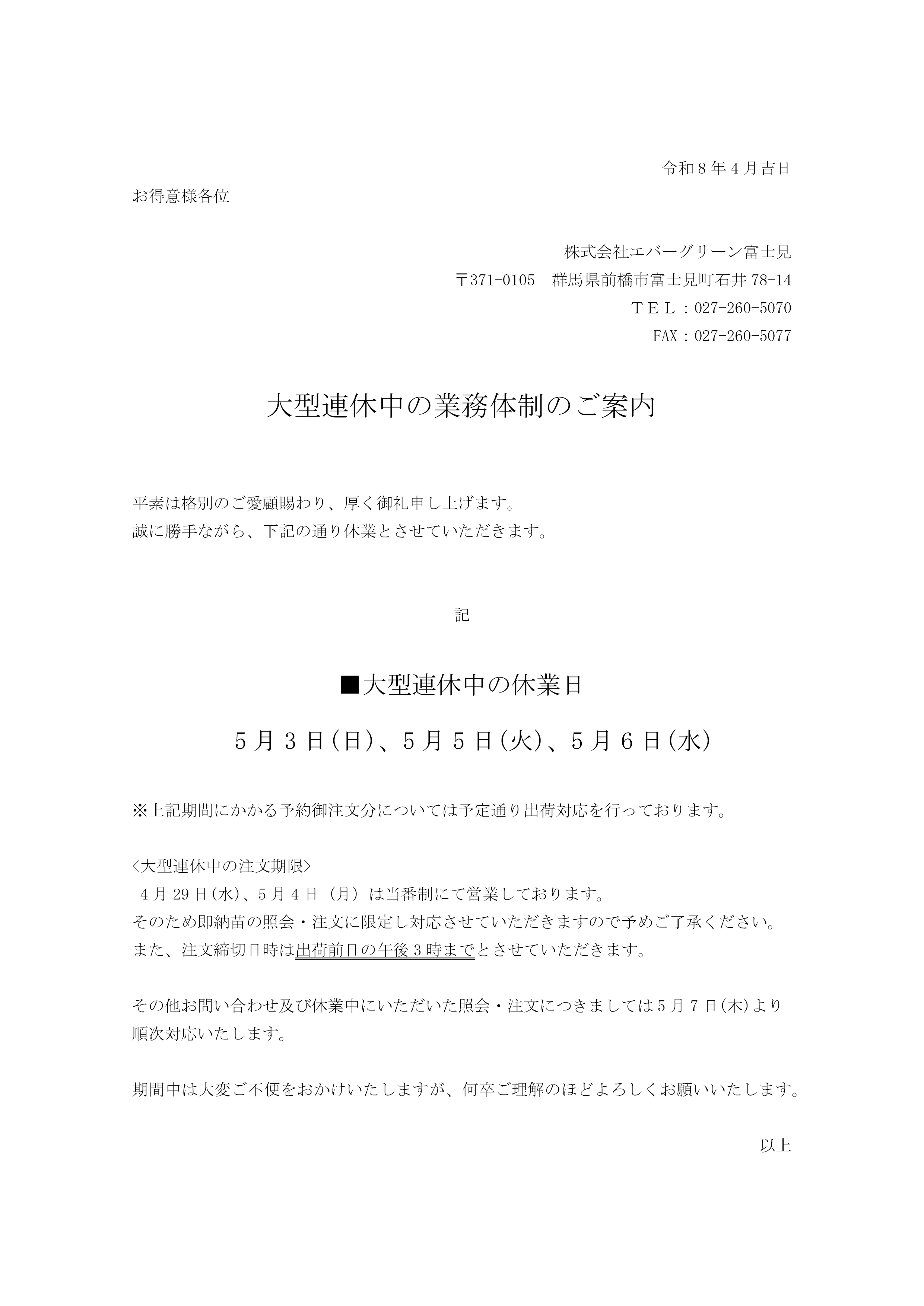 大型連休中の業務体制のご案内 2026年4月7日 お知らせ 法人様向け 関連記事 新年のご挨拶 年末年始休業のお知らせ 【ワークショップ開催】多肉植物寄せ植え体験inエバーグリーン富士見感謝祭 2025年度【感謝祭】開催のお知らせ 第28回富士見産業祭への出店のお知らせ 「新年のご挨拶」